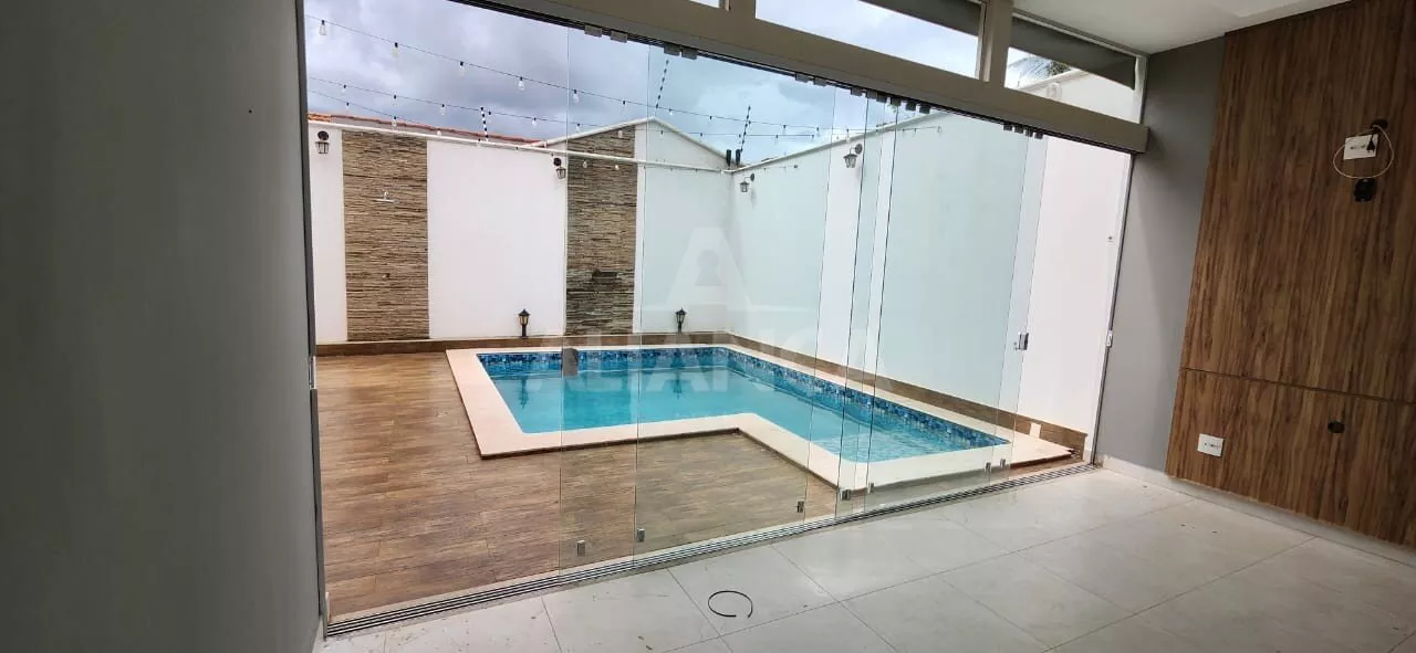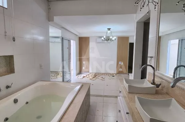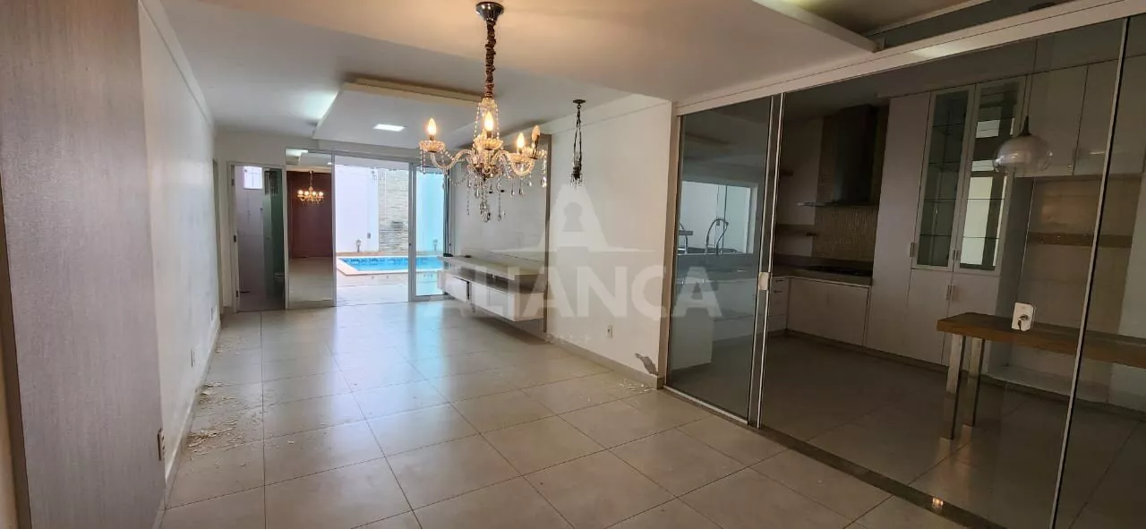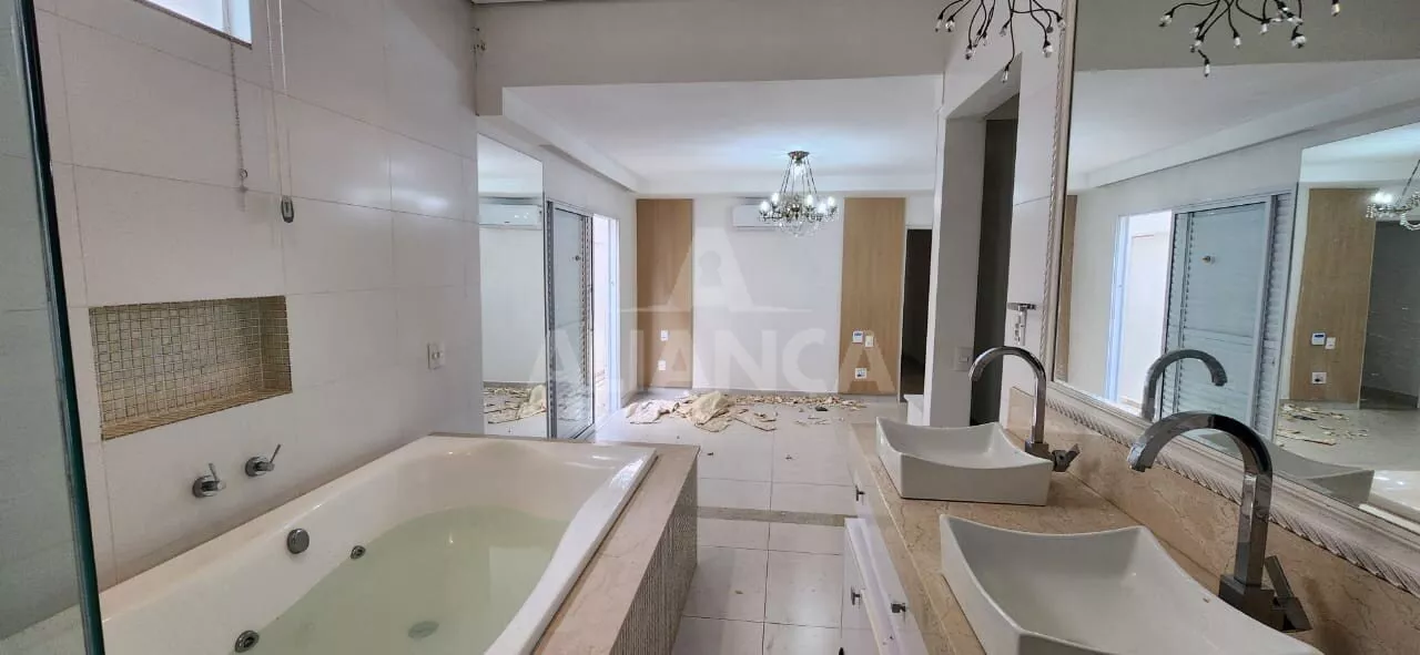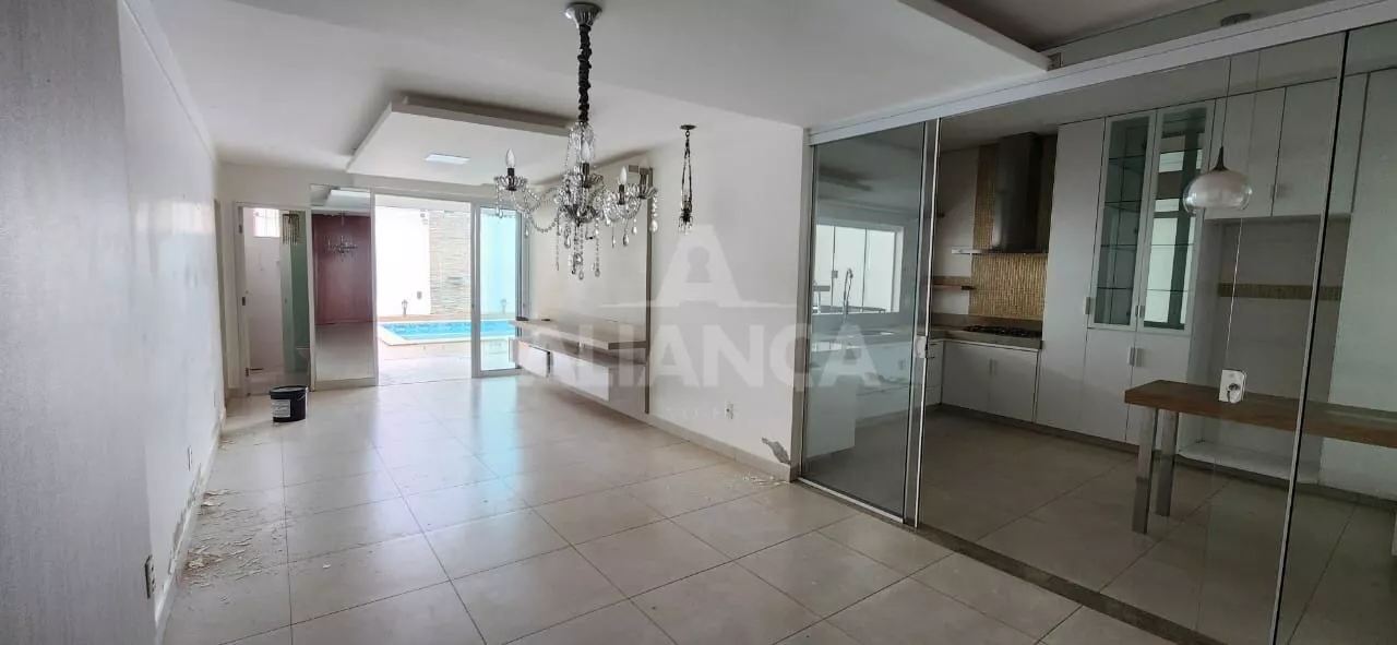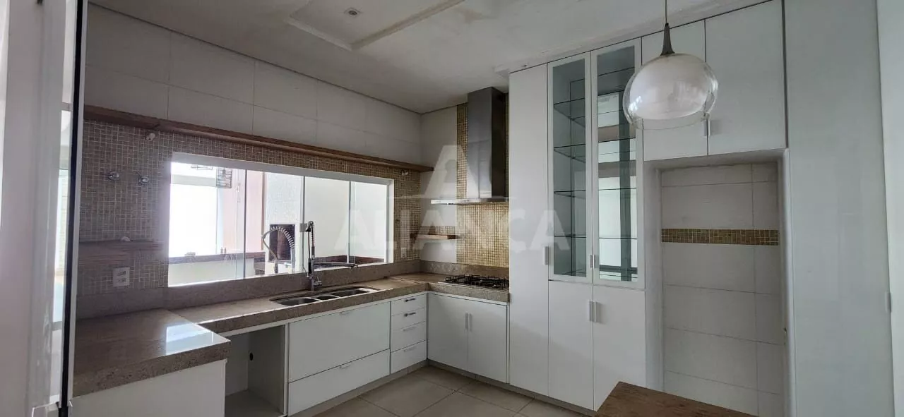 Sala em 02 ambientes com painel, lavabo, 03 quartos sendo 01 suíte com banheira de hidromassagem e 02 semi suites com armários, cozinha ampla com bastante armários, cooktop, área de serviços com armários, área de lazer completa com piscina aquecida, churrasqueira, cooktop, garagem para 02 carros cobertos e 02 descobertos, aquecedor solar nos banheiros, alarme